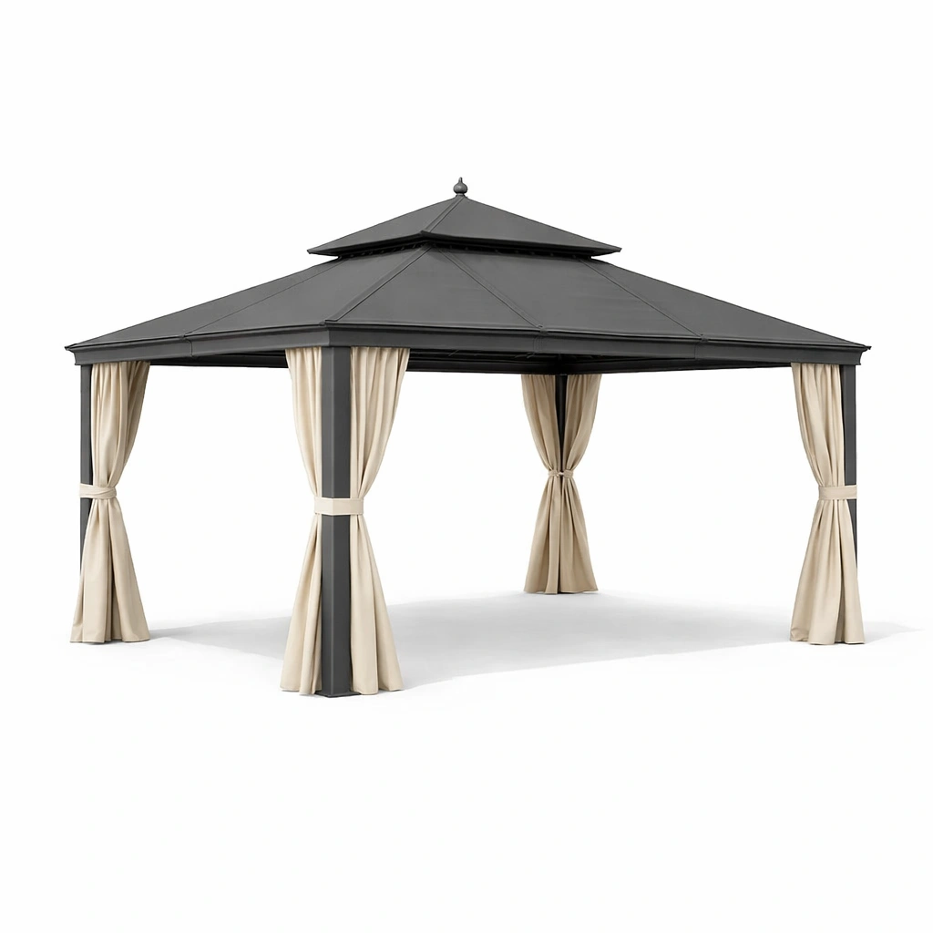 Gazebo de aluminio con techo de acero galvanizado y cortinas de poliéster beige