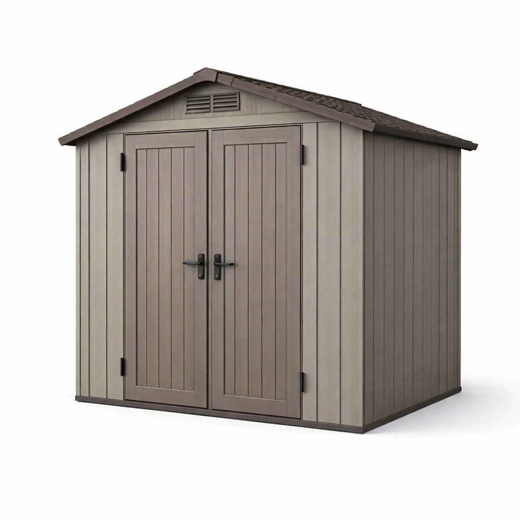 Equipado con puertas dobles con bisagras y cerradura con perno, proporcionando un acceso fácil y seguro. Adecuada para almacenamiento de herramientas y equipos de jardín.