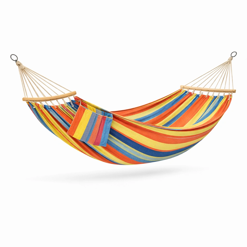 Hamaca fabricada en tejido de poliéster y algodón con barras de madera para mayor estabilidad. Soporta hasta 150 kg y tiene un diseño de rayas multicolor. Requiere instalación entre dos puntos fijos utilizando ganchos apropiados. Se recomienda lavado a mano para mantenimiento.